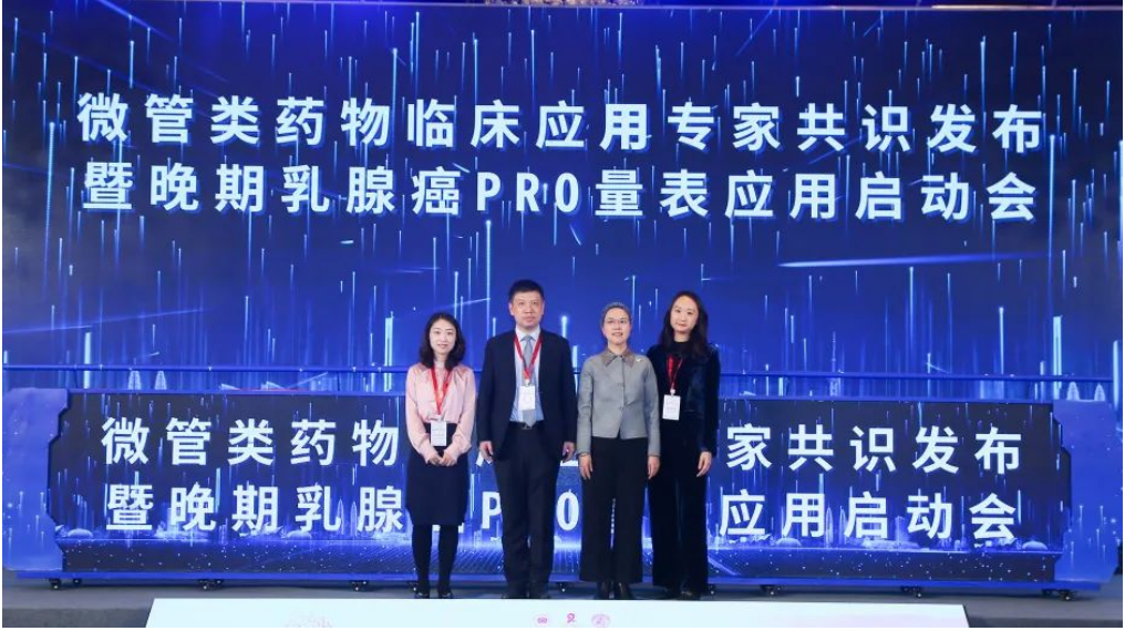 关印教授、卢雯平教授、吕大鹏教授、马飞教授、莫红楠教授、佟仲生教授、王文娜教授、徐玲教授、应红艳教授、钟秋子教授、张培礼教授、张永强教授等多位专家参与了微管类药物临床应用专家共识发布暨晚期乳腺癌PRO量表应用启动仪式。随后,莫红楠教授、佟仲生教授分别分享了《紫杉类药物真实世界PRO研究》与《新型微管类药物临床应用专家共识解读》。